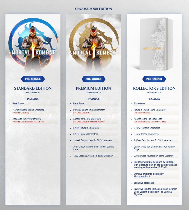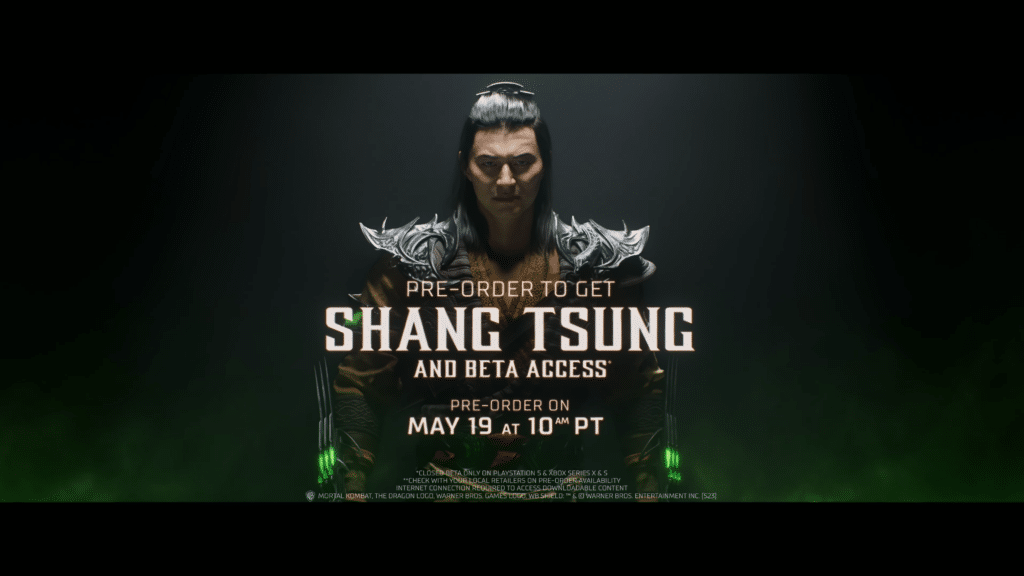 หากคุณสั่งซื้อ มอร์ทัล คอมแบท 1 ล่วงหน้าคุณจะได้รับ Shang Tsung ในทุกแพลตฟอร์ม บนPS5หรือXbox Series S|X เเละ สามารถเข้าถึงเบต้า ได้ในเดือน สิงหาคม 2023 เเละ ได้รับการประกาศเมื่อเร็ว ๆ นี้ ที่มาพร้อมกับ ตัวอย่าง CGI และกำลังมาถึงคอนโซลรุ่นปัจจุบัน เเละมีการเปิดเผยเนื้อหาและรายละเอียดเพิ่มเติมแล้ว